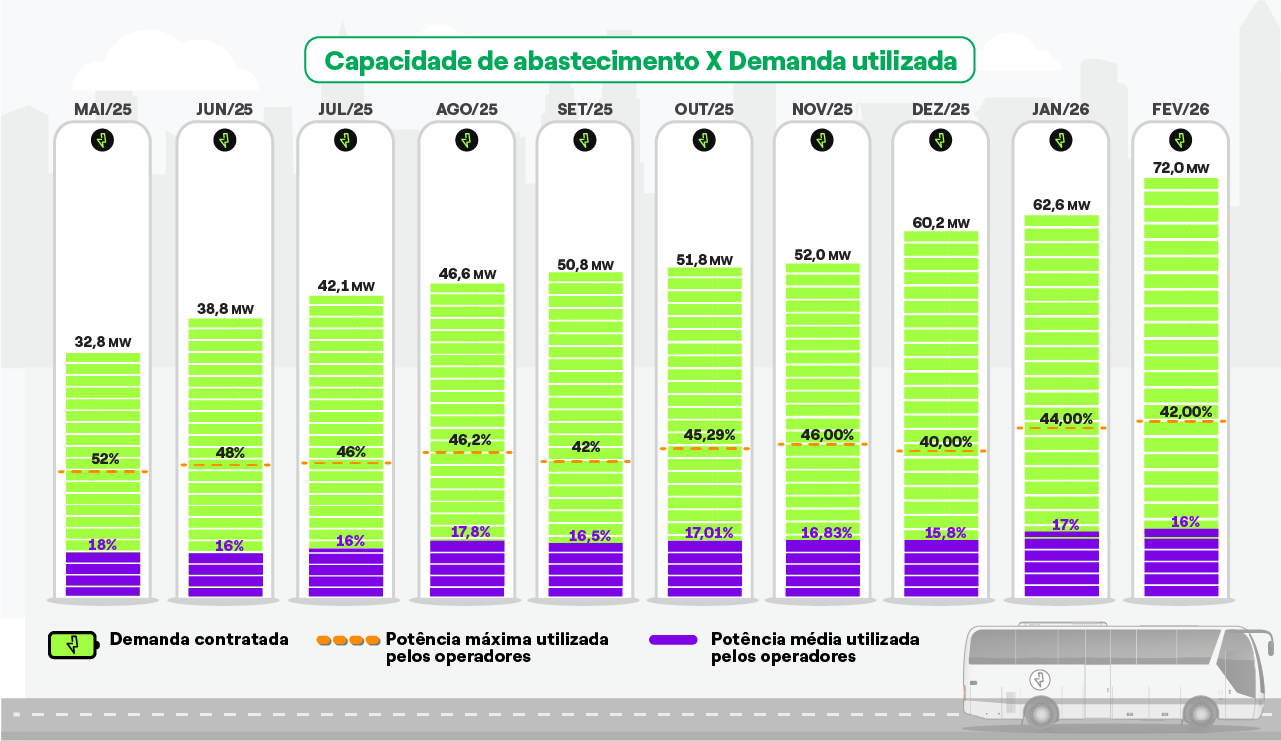 - A Enel Distribuição São Paulo informa que tem atendido a toda demanda de infraestrutura elétrica planejada e demandada pelos operadores de ônibus. Desde 2024, a companhia entregou 72 MW de energia a 25 garagens de ônibus, energia capaz de abastecer pelo menos 1.601 ônibus.