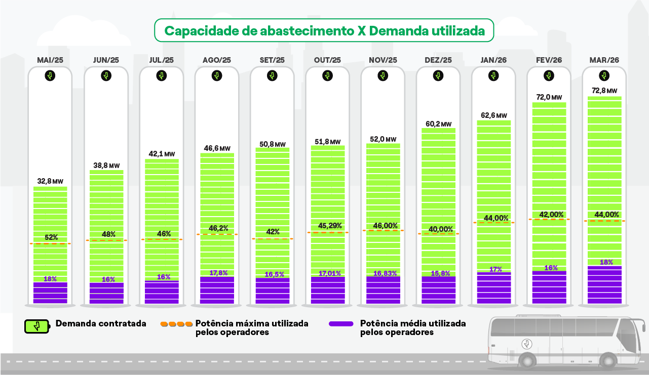 A Enel Distribuição São Paulo informa que tem atendido a toda demanda de infraestrutura elétrica planejada e demandada pelos operadores de ônibus. Desde 2024, a companhia entregou 72,8 MW de energia a 29 garagens de ônibus, energia capaz de abastecer pelo menos 1.618 ônibus.