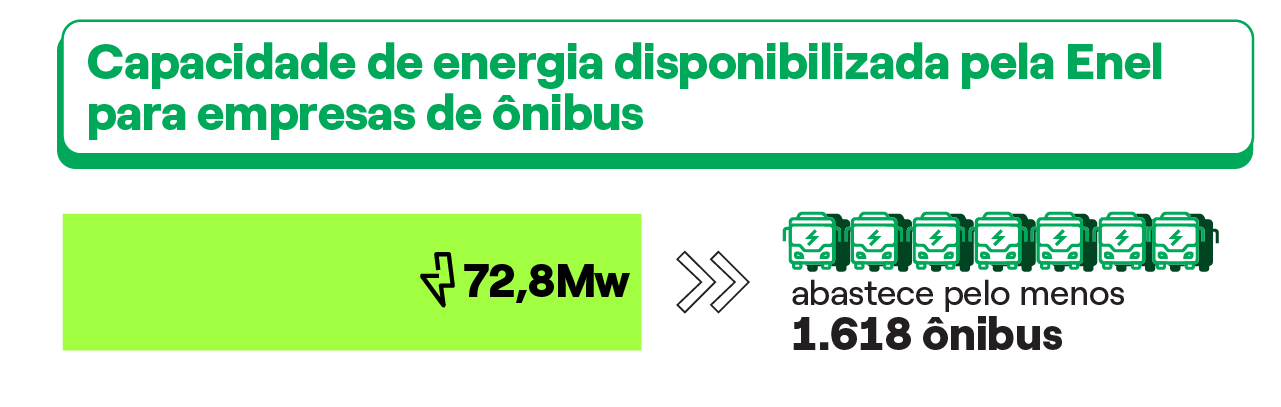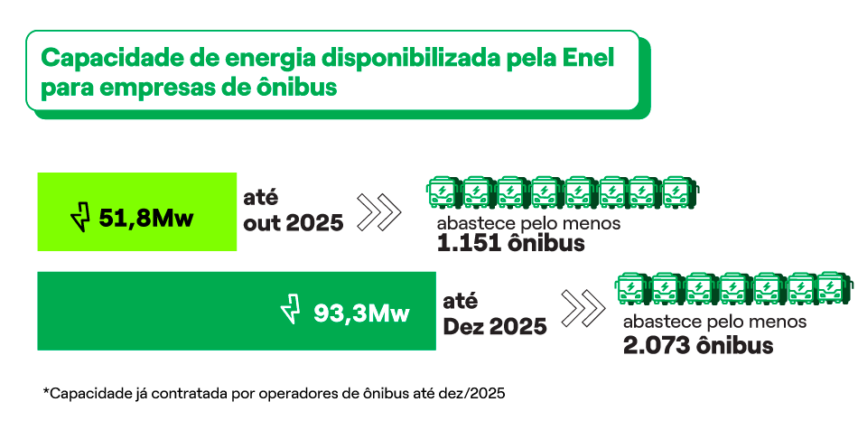 - Às operadoras de ônibus, cabe apenas uma parcela reduzida do investimento, restrita às adaptações internas em suas próprias instalações. Esse modelo reforça o compromisso da Enel em liderar a transição para uma mobilidade urbana mais limpa e sustentável.