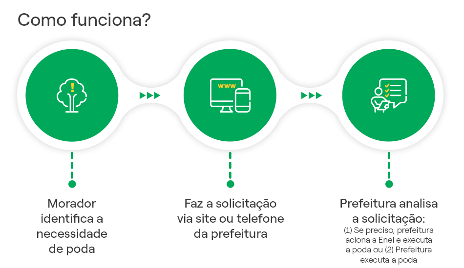 Em São Paulo, pedidos de poda ou remoção de árvores devem ser feitos diretamente à prefeitura, pelo site ou pelo telefone 156. Para os outros municípios da área de concessão, os pedidos também devem ser direcionados as prefeituras das respectivas cidades, que irá analisar cada caso e pode atuar sozinha ou, se precisar, com apoio da Enel.