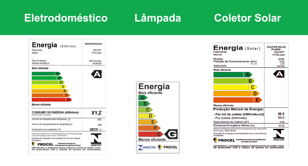 Elas aparecem em eletrodomésticos, lâmpadas e coletores solares, trazendo informações sobre consumo e desempenho para ajudar você a escolher modelos mais econômicos e sustentáveis. Confira as variações abaixo:
