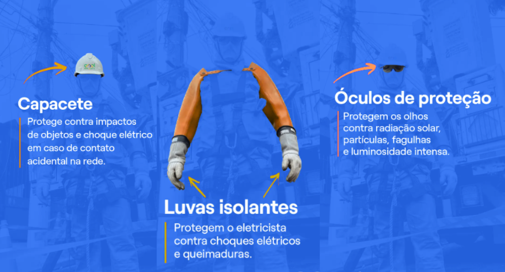 Cada EPI tem uma função específica: o capacete protege contra impactos e choques elétricos em caso de contato acidental com a rede.